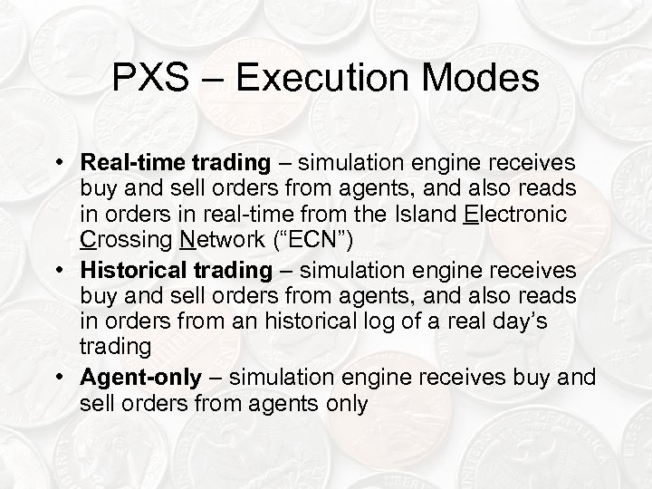PXS – Execution Modes • Real-time trading – simulation engine receives buy and sell orders from agents, and also reads in orders in real-time from the Island Electronic Crossing Network (“ECN”) • Historical trading – simulation engine receives buy and sell orders from agents, and also reads in orders from an historical log of a real day’s trading • Agent-only – simulation engine receives buy and sell orders from agents only