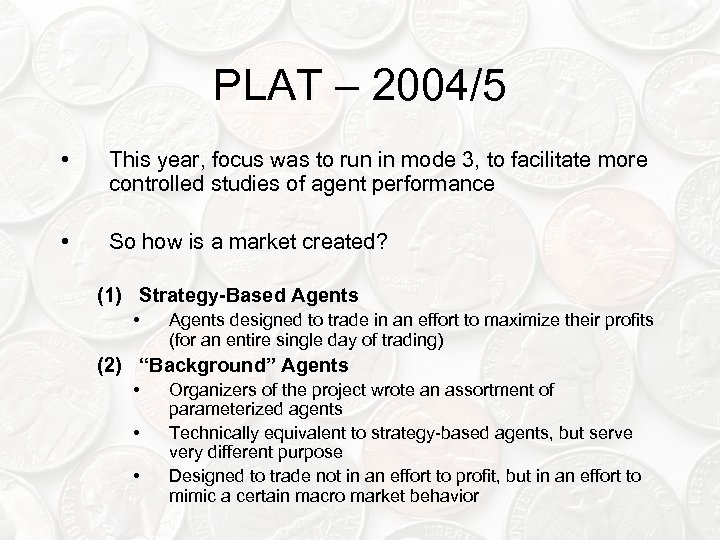 PLAT – 2004/5 • This year, focus was to run in mode 3, to facilitate more controlled studies of agent performance • So how is a market created? (1) Strategy-Based Agents • Agents designed to trade in an effort to maximize their profits (for an entire single day of trading) (2) “Background” Agents • • • Organizers of the project wrote an assortment of parameterized agents Technically equivalent to strategy-based agents, but serve very different purpose Designed to trade not in an effort to profit, but in an effort to mimic a certain macro market behavior