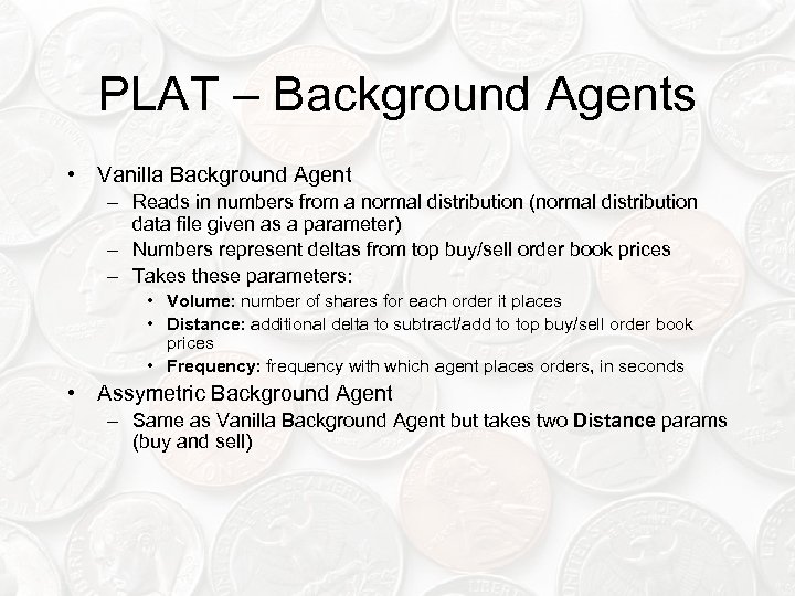 PLAT – Background Agents • Vanilla Background Agent – Reads in numbers from a normal distribution (normal distribution data file given as a parameter) – Numbers represent deltas from top buy/sell order book prices – Takes these parameters: • Volume: number of shares for each order it places • Distance: additional delta to subtract/add to top buy/sell order book prices • Frequency: frequency with which agent places orders, in seconds • Assymetric Background Agent – Same as Vanilla Background Agent but takes two Distance params (buy and sell)