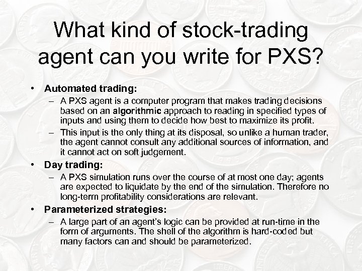 What kind of stock-trading agent can you write for PXS? • Automated trading: – A PXS agent is a computer program that makes trading decisions based on an algorithmic approach to reading in specified types of inputs and using them to decide how best to maximize its profit. – This input is the only thing at its disposal, so unlike a human trader, the agent cannot consult any additional sources of information, and it cannot act on soft judgement. • Day trading: – A PXS simulation runs over the course of at most one day; agents are expected to liquidate by the end of the simulation. Therefore no long-term profitability considerations are relevant. • Parameterized strategies: – A large part of an agent’s logic can be provided at run-time in the form of arguments. The shell of the algorithm is hard-coded but many factors can and should be parameterized.