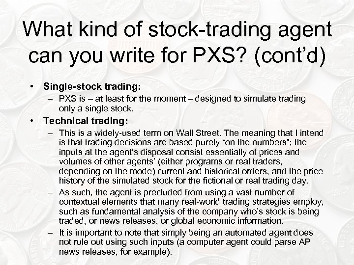 What kind of stock-trading agent can you write for PXS? (cont’d) • Single-stock trading: – PXS is – at least for the moment – designed to simulate trading only a single stock. • Technical trading: – This is a widely-used term on Wall Street. The meaning that I intend is that trading decisions are based purely “on the numbers”; the inputs at the agent’s disposal consist essentially of prices and volumes of other agents’ (either programs or real traders, depending on the mode) current and historical orders, and the price history of the simulated stock for the fictional or real trading day. – As such, the agent is precluded from using a vast number of contextual elements that many real-world trading strategies employ, such as fundamental analysis of the company who’s stock is being traded, or news releases, or global economic information. – It is important to note that simply being an automated agent does not rule out using such inputs (a computer agent could parse AP news releases, for example).