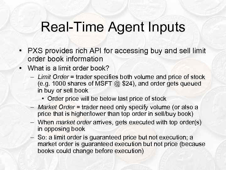 Real-Time Agent Inputs • PXS provides rich API for accessing buy and sell limit order book information • What is a limit order book? – Limit Order = trader specifies both volume and price of stock (e. g. 1000 shares of MSFT @ $24), and order gets queued in buy or sell book • Order price will be below last price of stock – Market Order = trader need only specify volume (or also a price that is higher/lower than top order in sell/buy book) – When market order arrives, gets executed with top order(s) in opposing book – So: a limit order is guaranteed price but not execution; a market order is guaranteed execution but not price (because books could change before execution)