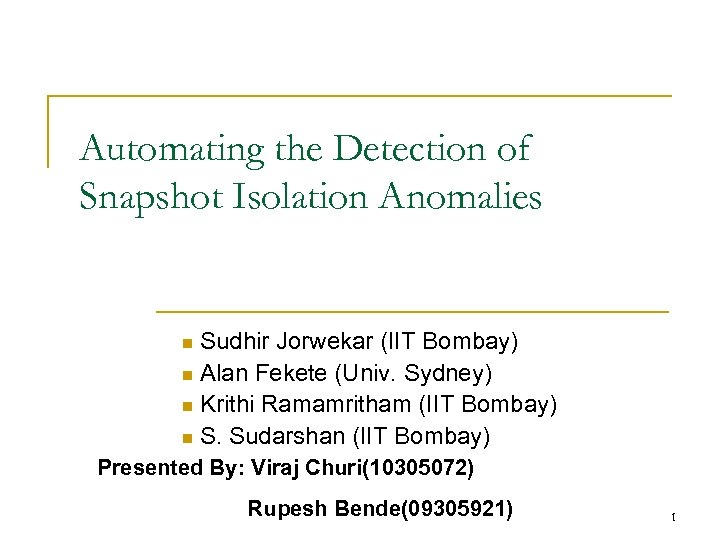 Automating the Detection of Snapshot Isolation Anomalies Sudhir Jorwekar (IIT Bombay) Alan Fekete (Univ. Sydney) Krithi Ramamritham (IIT Bombay) S. Sudarshan (IIT Bombay) Presented By: Viraj Churi(10305072) Rupesh Bende(09305921) 1