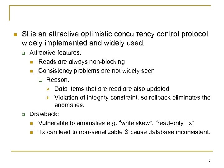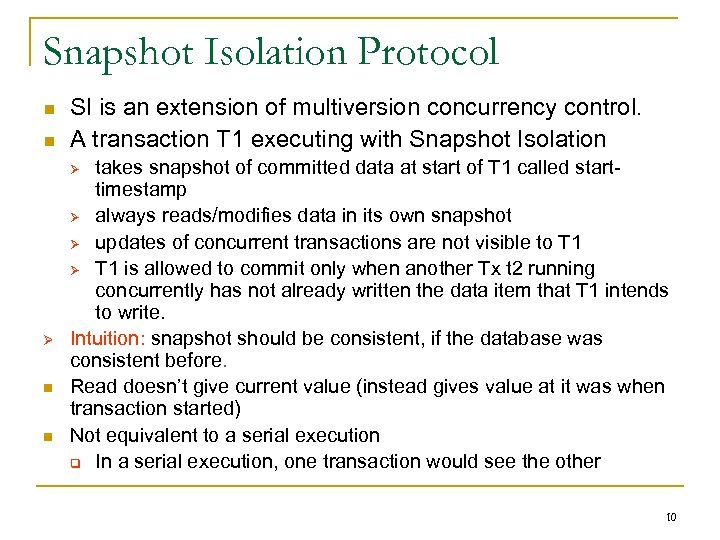 SI is an attractive optimistic concurrency control protocol widely implemented and widely used. Attractive features: Reads are always non-blocking Consistency problems are not widely seen Reason: Data items that are read are also updated Violation of integrity constraint, so rollback eliminates the anomalies. Drawback: Vulnerable to anomalies e. g. “write skew”, “read-only Tx” Tx can lead to non-serializable & cause database inconsistent. 9