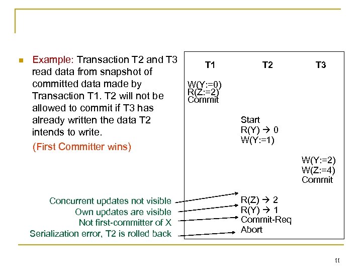 Snapshot Isolation Protocol SI is an extension of multiversion concurrency control. A transaction T 1 executing with Snapshot Isolation takes snapshot of committed data at start of T 1 called starttimestamp always reads/modifies data in its own snapshot updates of concurrent transactions are not visible to T 1 is allowed to commit only when another Tx t 2 running concurrently has not already written the data item that T 1 intends to write. Intuition: snapshot should be consistent, if the database was consistent before. Read doesn’t give current value (instead gives value at it was when transaction started) Not equivalent to a serial execution In a serial execution, one transaction would see the other 10