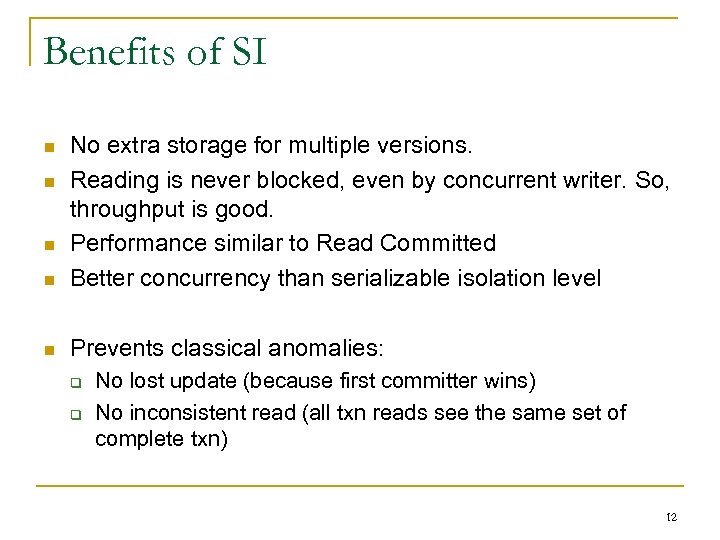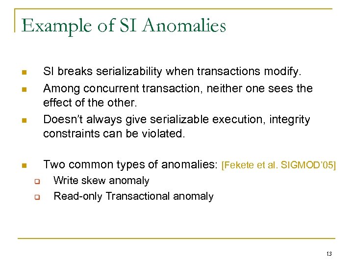 Benefits of SI No extra storage for multiple versions. Reading is never blocked, even by concurrent writer. So, throughput is good. Performance similar to Read Committed Better concurrency than serializable isolation level Prevents classical anomalies: No lost update (because first committer wins) No inconsistent read (all txn reads see the same set of complete txn) 12