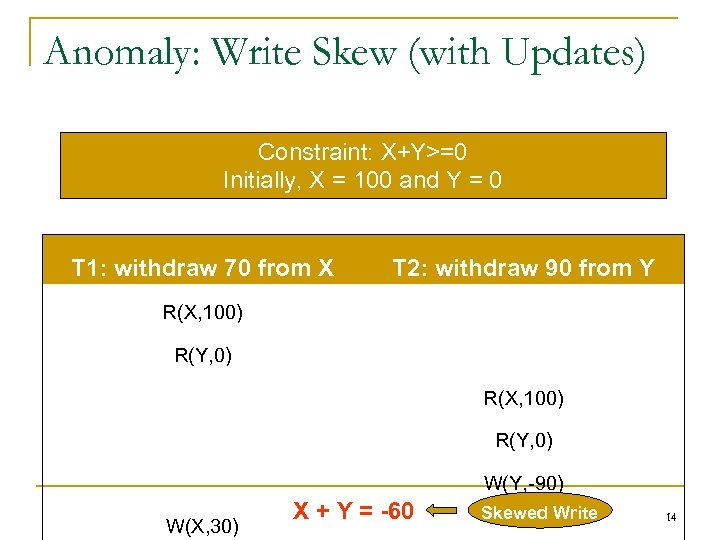 Example of SI Anomalies SI breaks serializability when transactions modify. Among concurrent transaction, neither one sees the effect of the other. Doesn’t always give serializable execution, integrity constraints can be violated. Two common types of anomalies: [Fekete et al. SIGMOD’ 05] Write skew anomaly Read-only Transactional anomaly 13