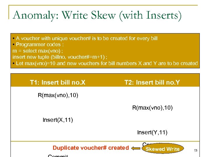 Anomaly: Write Skew (with Updates) Constraint: X+Y>=0 Initially, X = 100 and Y = 0 T 1: withdraw 70 from X T 2: withdraw 90 from Y R(X, 100) R(Y, 0) W(Y, -90) W(X, 30) X + Y = -60 Skewed Write 14
