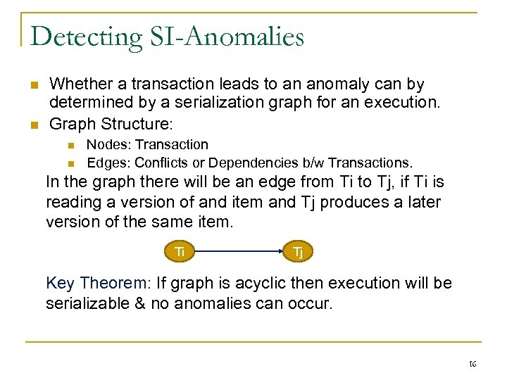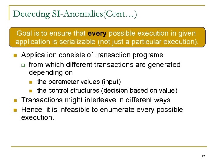 Detecting SI-Anomalies Whether a transaction leads to an anomaly can by determined by a serialization graph for an execution. Graph Structure: Nodes: Transaction Edges: Conflicts or Dependencies b/w Transactions. In the graph there will be an edge from Ti to Tj, if Ti is reading a version of and item and Tj produces a later version of the same item. Ti Tj Key Theorem: If graph is acyclic then execution will be serializable & no anomalies can occur. 16