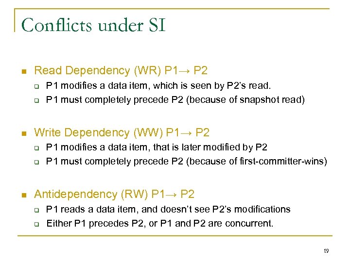 Conflicts under SI Read Dependency (WR) P 1→ P 2 Write Dependency (WW) P 1→ P 2 P 1 modifies a data item, which is seen by P 2’s read. P 1 must completely precede P 2 (because of snapshot read) P 1 modifies a data item, that is later modified by P 2 P 1 must completely precede P 2 (because of first-committer-wins) Antidependency (RW) P 1→ P 2 P 1 reads a data item, and doesn’t see P 2’s modifications Either P 1 precedes P 2, or P 1 and P 2 are concurrent. 19