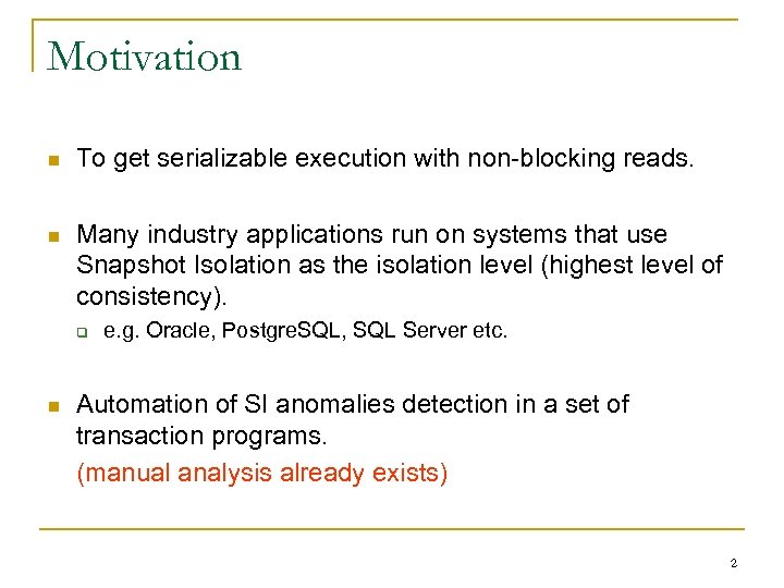 Motivation To get serializable execution with non-blocking reads. Many industry applications run on systems that use Snapshot Isolation as the isolation level (highest level of consistency). e. g. Oracle, Postgre. SQL, SQL Server etc. Automation of SI anomalies detection in a set of transaction programs. (manual analysis already exists) 2