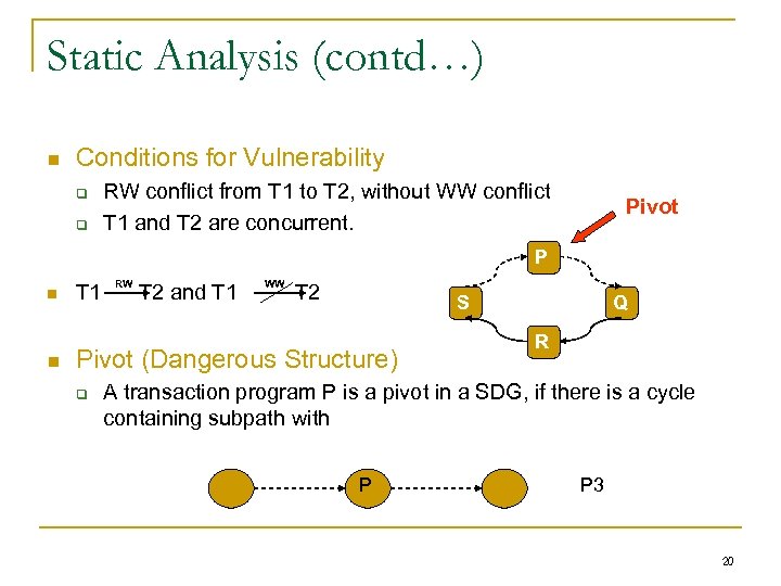 Static Analysis (contd…) Conditions for Vulnerability RW conflict from T 1 to T 2, without WW conflict T 1 and T 2 are concurrent. Pivot P T 1 RW T 2 and T 1 WW T 2 S Pivot (Dangerous Structure) Q R A transaction program P is a pivot in a SDG, if there is a cycle containing subpath with P P 3 20