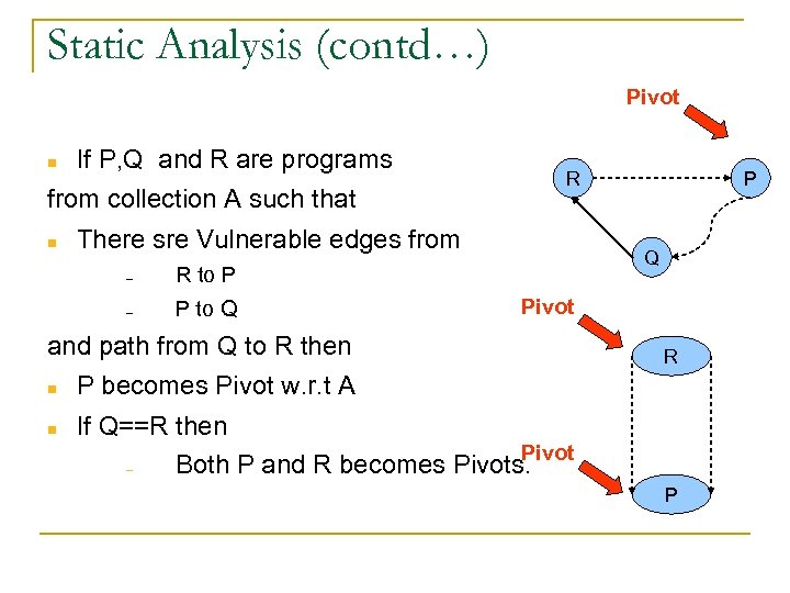 Static Analysis (contd…) Pivot If P, Q and R are programs from collection A such that R There sre Vulnerable edges from – P to Q Q R to P – Pivot and path from Q to R then P R P becomes Pivot w. r. t A If Q==R then Pivot – Both P and R becomes Pivots. P