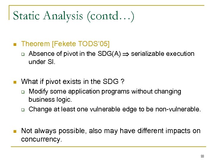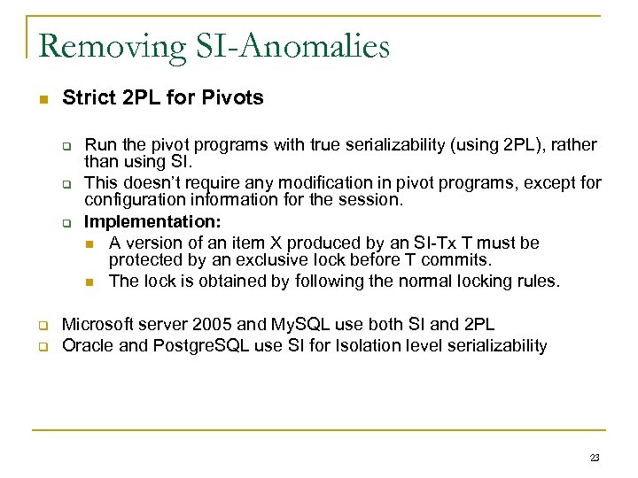 Static Analysis (contd…) Theorem [Fekete TODS’ 05] What if pivot exists in the SDG ? Absence of pivot in the SDG(A) serializable execution under SI. Modify some application programs without changing business logic. Change at least one vulnerable edge to be non-vulnerable. Not always possible, also may have different impacts on concurrency. 22