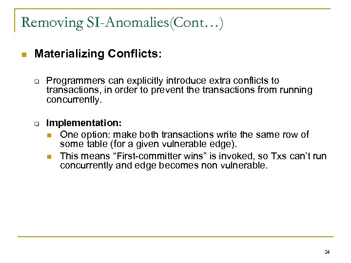 Removing SI-Anomalies Strict 2 PL for Pivots Run the pivot programs with true serializability (using 2 PL), rather than using SI. This doesn’t require any modification in pivot programs, except for configuration information for the session. Implementation: A version of an item X produced by an SI-Tx T must be protected by an exclusive lock before T commits. The lock is obtained by following the normal locking rules. Microsoft server 2005 and My. SQL use both SI and 2 PL Oracle and Postgre. SQL use SI for Isolation level serializability 23