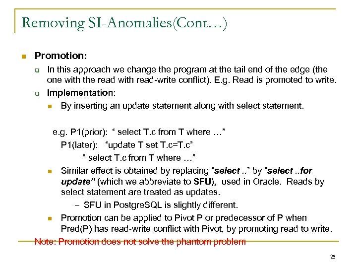 Removing SI-Anomalies(Cont…) Materializing Conflicts: Programmers can explicitly introduce extra conflicts to transactions, in order to prevent the transactions from running concurrently. Implementation: One option: make both transactions write the same row of some table (for a given vulnerable edge). This means “First-committer wins” is invoked, so Txs can’t run concurrently and edge becomes non vulnerable. 24