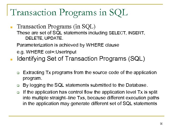 Transaction Programs in SQL Transaction Programs (in SQL) These are set of SQL statements including SELECT, INSERT, DELETE, UPDATE. Parameterization is achieved by WHERE clause e. g. WHERE col=: User. Input Identifying Set of Transaction Programs (SQL) Extracting Tx programs from the source code of the application program. By logging the SQL statements submitted to the Database. If the application has control flow the application level Tx is split into multiple straight–line Txs, because different execution paths in the application may generate different set of SQL statements 26