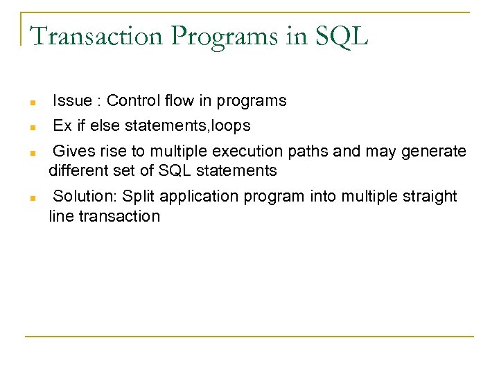 Transaction Programs in SQL Issue : Control flow in programs Ex if else statements, loops Gives rise to multiple execution paths and may generate different set of SQL statements Solution: Split application program into multiple straight line transaction