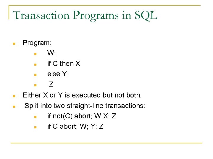 Transaction Programs in SQL Program: W; if C then X else Y; Z Either X or Y is executed but not both. Split into two straight-line transactions: if not(C) abort; W; X; Z if C abort; W; Y; Z