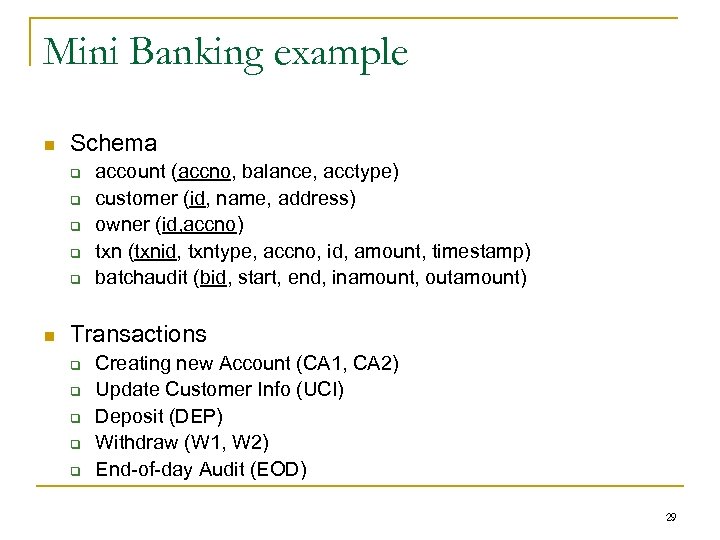 Mini Banking example Schema account (accno, balance, acctype) customer (id, name, address) owner (id, accno) txn (txnid, txntype, accno, id, amount, timestamp) batchaudit (bid, start, end, inamount, outamount) Transactions Creating new Account (CA 1, CA 2) Update Customer Info (UCI) Deposit (DEP) Withdraw (W 1, W 2) End-of-day Audit (EOD) 29