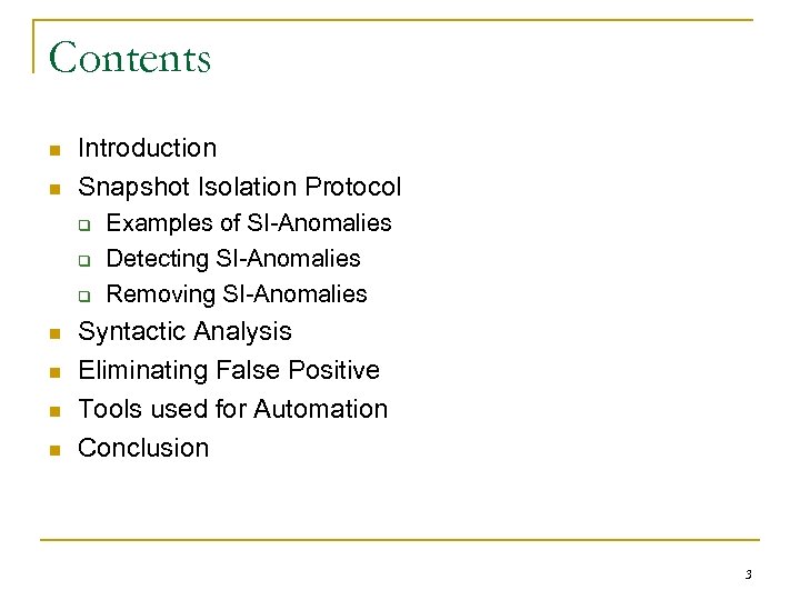 Contents Introduction Snapshot Isolation Protocol Examples of SI-Anomalies Detecting SI-Anomalies Removing SI-Anomalies Syntactic Analysis Eliminating False Positive Tools used for Automation Conclusion 3