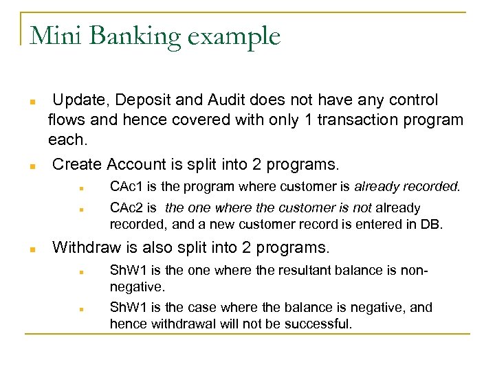 Mini Banking example Update, Deposit and Audit does not have any control flows and hence covered with only 1 transaction program each. Create Account is split into 2 programs. CAc 1 is the program where customer is already recorded. CAc 2 is the one where the customer is not already recorded, and a new customer record is entered in DB. Withdraw is also split into 2 programs. Sh. W 1 is the one where the resultant balance is nonnegative. Sh. W 1 is the case where the balance is negative, and hence withdrawal will not be successful.