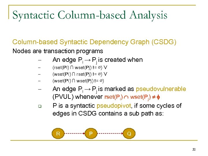 Syntactic Column-based Analysis Column-based Syntactic Dependency Graph (CSDG) Nodes are transaction programs – An edge Pi → Pj is created when – – – (rset(Pi) ∩ wset(Pj) != ∅) ∨ (wset(Pi) ∩ rset(Pj) != ∅) ∨ (wset(Pi) ∩ wset(Pj) != ∅) – An edge Pi → Pj is marked as pseudovulnerable (PVUL) whenever rset(Pi) wset(Pj) P is a syntactic pseudopivot, if some cycles of edges in CSDG contains a sub path as: R P Q 32