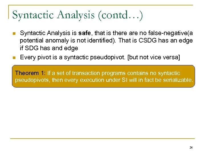 Syntactic Analysis (contd…) Syntactic Analysis is safe, that is there are no false-negative(a potential anomaly is not identified). That is CSDG has an edge if SDG has and edge Every pivot is a syntactic pseudopivot. [but not vice versa] Theorem 1: If a set of transaction programs contains no syntactic pseudopivots, then every execution under SI will in fact be serializable. 34