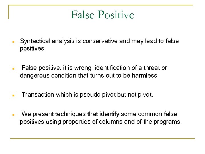 False Positive Syntactical analysis is conservative and may lead to false positives. False positive: it is wrong identification of a threat or dangerous condition that turns out to be harmless. Transaction which is pseudo pivot but not pivot. We present techniques that identify some common false positives using properties of columns and of the programs.