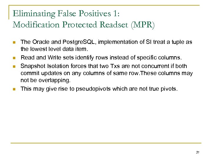 Eliminating False Positives 1: Modification Protected Readset (MPR) The Oracle and Postgre. SQL, implementation of SI treat a tuple as the lowest level data item. Read and Write sets identify rows instead of specific columns. Snapshot Isolation forces that two Txs are not concurrent if both commit updates on any columns of same row. These columns may not be overlapping. This may give rise to pseudopivots which are not true pivots. 37