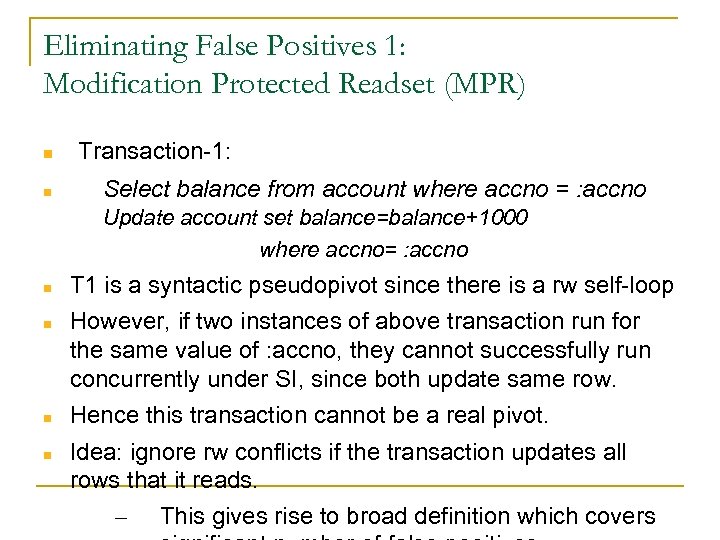 Eliminating False Positives 1: Modification Protected Readset (MPR) Transaction-1: Select balance from account where accno = : accno Update account set balance=balance+1000 where accno= : accno T 1 is a syntactic pseudopivot since there is a rw self-loop However, if two instances of above transaction run for the same value of : accno, they cannot successfully run concurrently under SI, since both update same row. Hence this transaction cannot be a real pivot. Idea: ignore rw conflicts if the transaction updates all rows that it reads. – This gives rise to broad definition which covers