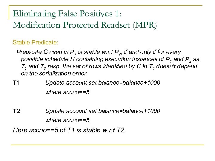 Eliminating False Positives 1: Modification Protected Readset (MPR) Stable Predicate: Predicate C used in P 1 is stable w. r. t P 2, if and only if for every possible schedule H containing execution instances of P 1 and P 2 as T 1 and T 2 resp, the set of rows identified by C in T 1 doesn’t depend on the serialization order. T 1 Update account set balance=balance+1000 where accno==5 T 2 Update account set balance=balance+1000 where accno==5 Here accno==5 of T 1 is stable w. r. t T 2.