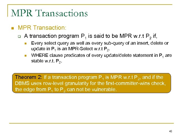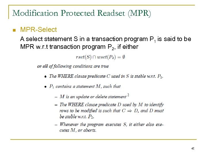 Modification Protected Readset (MPR) MPR-Select A select statement S in a transaction program P 1 is said to be MPR w. r. t transaction program P 2, if either 41