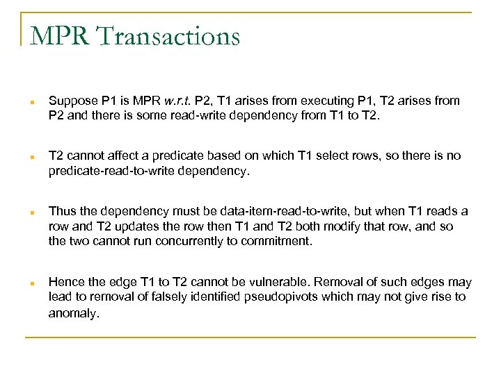 MPR Transactions Suppose P 1 is MPR w. r. t. P 2, T 1 arises from executing P 1, T 2 arises from P 2 and there is some read-write dependency from T 1 to T 2 cannot affect a predicate based on which T 1 select rows, so there is no predicate-read-to-write dependency. Thus the dependency must be data-item-read-to-write, but when T 1 reads a row and T 2 updates the row then T 1 and T 2 both modify that row, and so the two cannot run concurrently to commitment. Hence the edge T 1 to T 2 cannot be vulnerable. Removal of such edges may lead to removal of falsely identified pseudopivots which may not give rise to anomaly.