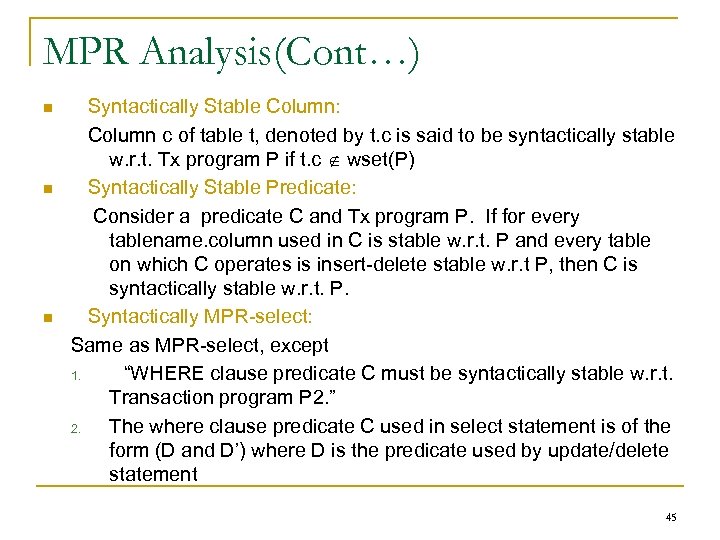 MPR Analysis MPR Analysis: We say that a transaction is found to be a false positive using MPR analysis if It is detected as a syntactic pseudopivot, and After eliminating vulnerable edges using theorem-2, the transaction is found not be a pivot MPR analysis depends on understanding predicates - Idea: create a simpler syntactic definition that does not need to understand predicates Insert-Delete Stable Table: A table t is said to be insert-delete stable w. r. t Tx program P, if P doesn’t contain any insert or delete statement which operates on table t. 44