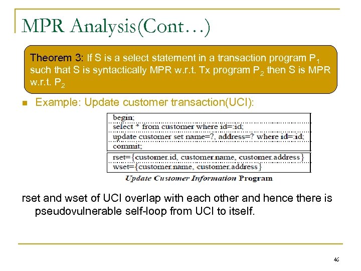 MPR Analysis(Cont…) Syntactically Stable Column: Column c of table t, denoted by t. c is said to be syntactically stable w. r. t. Tx program P if t. c wset(P) Syntactically Stable Predicate: Consider a predicate C and Tx program P. If for every tablename. column used in C is stable w. r. t. P and every table on which C operates is insert-delete stable w. r. t P, then C is syntactically stable w. r. t. P. Syntactically MPR-select: Same as MPR-select, except 1. “WHERE clause predicate C must be syntactically stable w. r. t. Transaction program P 2. ” 2. The where clause predicate C used in select statement is of the form (D and D’) where D is the predicate used by update/delete statement 45