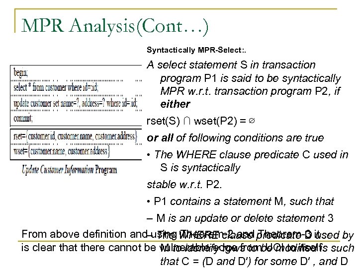 MPR Analysis(Cont…) Syntactically MPR-Select: . A select statement S in transaction program P 1 is said to be syntactically MPR w. r. t. transaction program P 2, if either rset(S) ∩ wset(P 2) = ∅ or all of following conditions are true • The WHERE clause predicate C used in S is syntactically stable w. r. t. P 2. • P 1 contains a statement M, such that – M is an update or delete statement 3 From above definition and–using WHERE clause predicate D it Theorem-2 and Theorem-3 used by is clear that there cannot be vulnerable edge frombe modified is such M to identify rows to UCI to itself. that C = (D and D′) for some D′ , and D