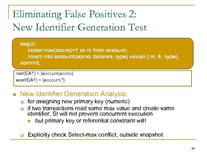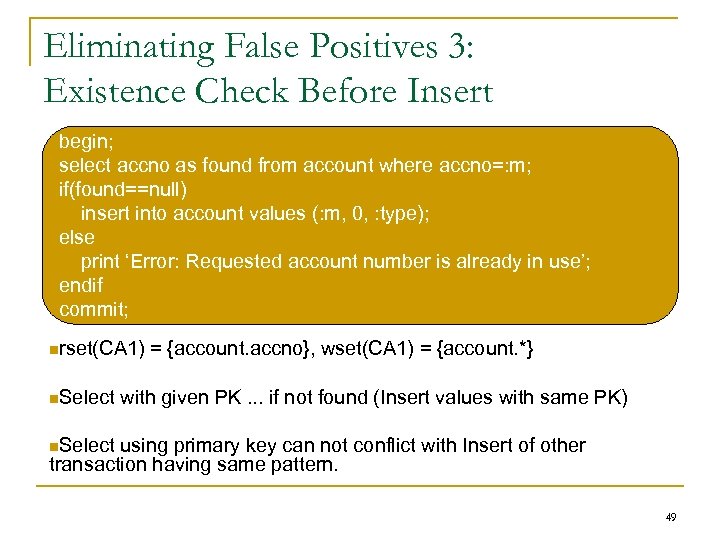 Eliminating False Positives 2: New Identifier Generation Test begin; select max(accno)+1 as m from account; insert into account(accno, balance, type) values (: m, 0, : type); commit; rset(CA 1) = {account. accno} wset(CA 1) = {account. *} New Identifier Generation Analysis: for assigning new primary key (numeric) if two transactions read same max value and create same identifier, SI will not prevent concurrent execution but primary key or referential constraint will! Explicitly check Select-max conflict, outside snapshot 48