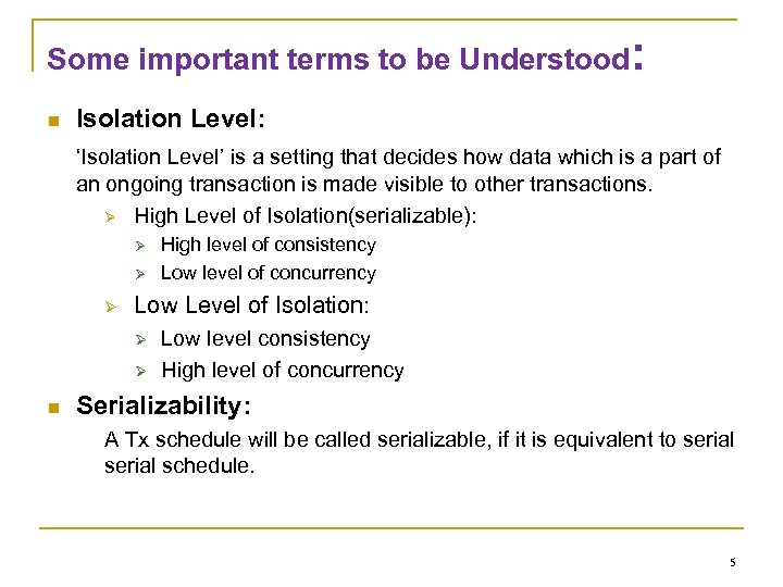 Some important terms to be Understood: Isolation Level: ‘Isolation Level’ is a setting that decides how data which is a part of an ongoing transaction is made visible to other transactions. High Level of Isolation(serializable): Low Level of Isolation: High level of consistency Low level of concurrency Low level consistency High level of concurrency Serializability: A Tx schedule will be called serializable, if it is equivalent to serial schedule. 5