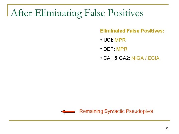 After Eliminating False Positives Eliminated False Positives: • UCI: MPR • DEP: MPR • CA 1 & CA 2: NIGA / ECIA Remaining Syntactic Pseudopivot 50