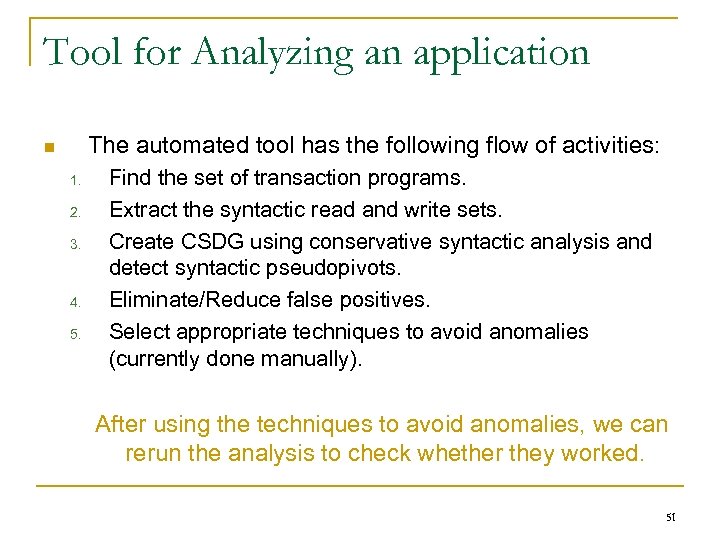 Tool for Analyzing an application The automated tool has the following flow of activities: 1. 2. 3. 4. 5. Find the set of transaction programs. Extract the syntactic read and write sets. Create CSDG using conservative syntactic analysis and detect syntactic pseudopivots. Eliminate/Reduce false positives. Select appropriate techniques to avoid anomalies (currently done manually). After using the techniques to avoid anomalies, we can rerun the analysis to check whether they worked. 51