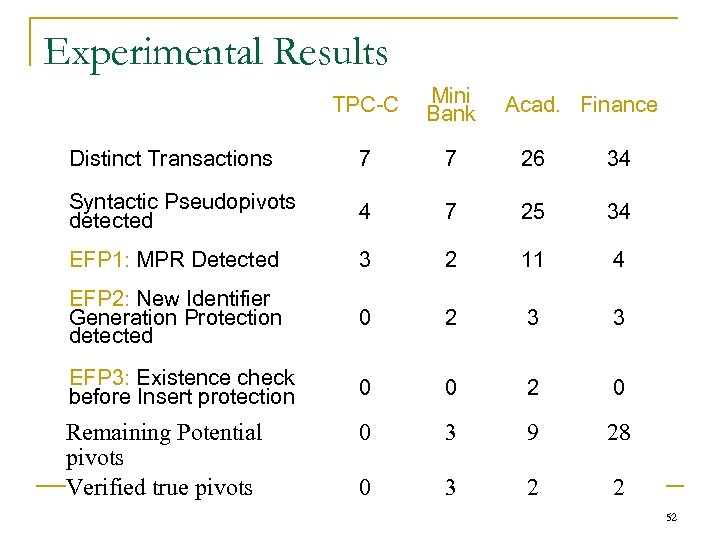 Experimental Results TPC-C Mini Bank Distinct Transactions 7 7 26 34 Syntactic Pseudopivots detected 4 7 25 34 EFP 1: MPR Detected 3 2 11 4 EFP 2: New Identifier Generation Protection detected 0 2 3 3 EFP 3: Existence check before Insert protection 0 0 2 0 Remaining Potential pivots Verified true pivots 0 3 9 28 0 3 2 2 Acad. Finance 52
