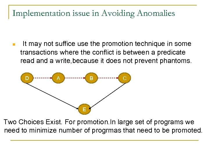 Implementation issue in Avoiding Anomalies It may not suffice use the promotion technique in some transactions where the conflict is between a predicate read and a write, because it does not prevent phantoms. D A B C E Two Choices Exist. For promotion. In large set of programs we need to minimize number of progrmas that need to be promoted.