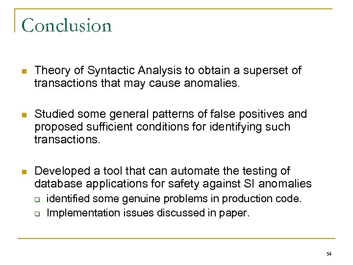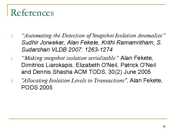 Conclusion Theory of Syntactic Analysis to obtain a superset of transactions that may cause anomalies. Studied some general patterns of false positives and proposed sufficient conditions for identifying such transactions. Developed a tool that can automate the testing of database applications for safety against SI anomalies identified some genuine problems in production code. Implementation issues discussed in paper. 54