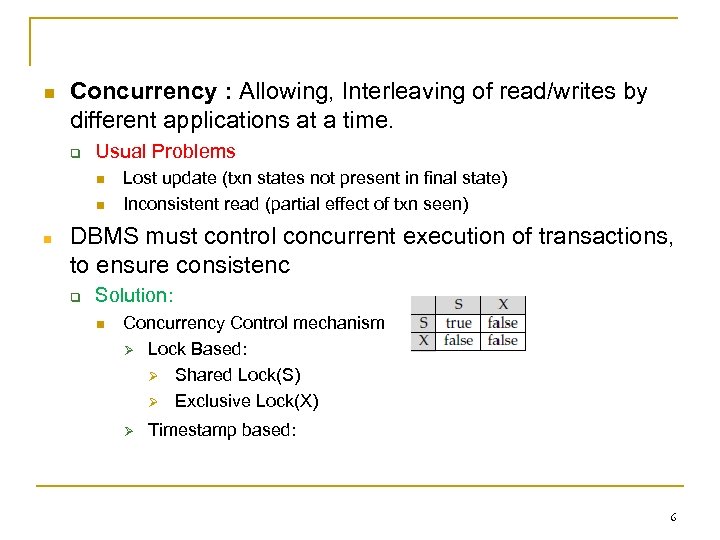 Concurrency : Allowing, Interleaving of read/writes by different applications at a time. Usual Problems Lost update (txn states not present in final state) Inconsistent read (partial effect of txn seen) DBMS must control concurrent execution of transactions, to ensure consistenc Solution: Concurrency Control mechanism Lock Based: Shared Lock(S) Exclusive Lock(X) Timestamp based: 6
