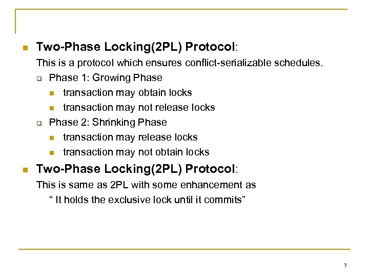 Two-Phase Locking(2 PL) Protocol: This is a protocol which ensures conflict-serializable schedules. Phase 1: Growing Phase transaction may obtain locks transaction may not release locks Phase 2: Shrinking Phase transaction may release locks transaction may not obtain locks Two-Phase Locking(2 PL) Protocol: This is same as 2 PL with some enhancement as “ It holds the exclusive lock until it commits” 7