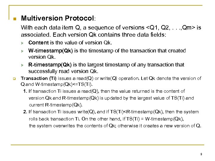 Multiversion Protocol: With each data item Q, a sequence of versions is associated. Each version Qk contains three data fields: Content is the value of version Qk. W-timestamp(Qk) is the timestamp of the transaction that created version Qk. R-timestamp(Qk) is the largest timestamp of any transaction that successfully read version Qk. Transaction (Ti) issues a read(Q) or write(Q) operation. Let Qk denote the version of Q and W-timestamp(Qk)<=TS(Ti). 1. If transaction Ti issues a read(Q), then the value returned is the content of version Qk and R-timestamp(Qk) is updated by the largest value of TS(Ti) and current R-timestamp(Qk). 2. If transaction Ti issues write(Q), and if TS(Ti)