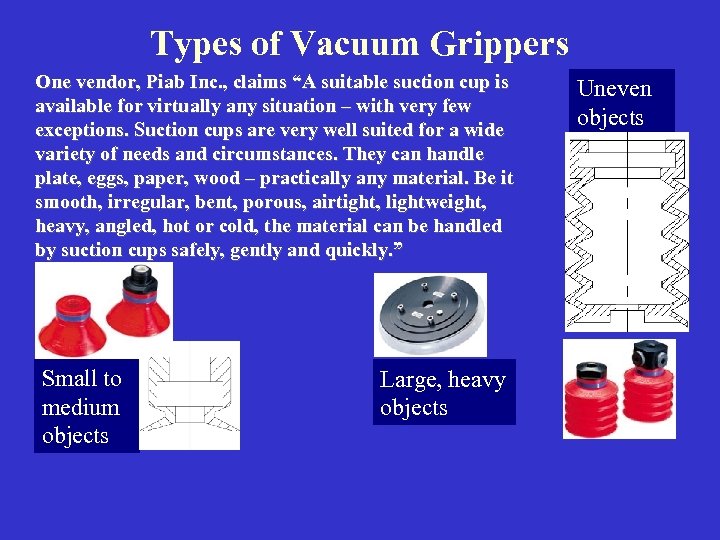 Types of Vacuum Grippers One vendor, Piab Inc. , claims “A suitable suction cup is available for virtually any situation – with very few exceptions. Suction cups are very well suited for a wide variety of needs and circumstances. They can handle plate, eggs, paper, wood – practically any material. Be it smooth, irregular, bent, porous, airtight, lightweight, heavy, angled, hot or cold, the material can be handled by suction cups safely, gently and quickly. ” Small to medium objects Large, heavy objects Uneven objects