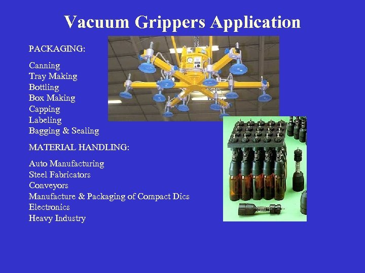 Vacuum Grippers Application PACKAGING: Canning Tray Making Bottling Box Making Capping Labeling Bagging & Sealing MATERIAL HANDLING: Auto Manufacturing Steel Fabricators Conveyors Manufacture & Packaging of Compact Dics Electronics Heavy Industry