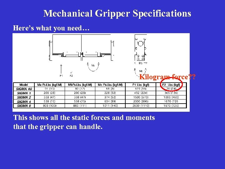 Mechanical Gripper Specifications Here’s what you need… Kilogram force? ? This shows all the static forces and moments that the gripper can handle.